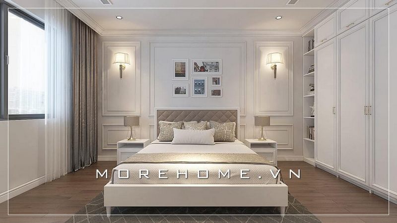 Trang trí nội thất phòng ngủ chung cư hiện đại ấn tượng với giường ngủ màu trắng tinh tế