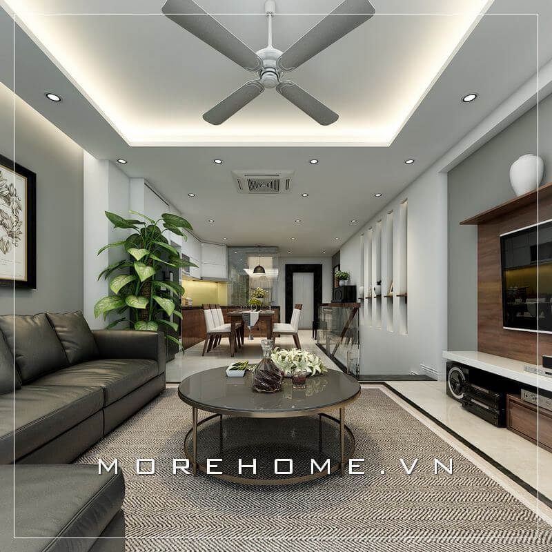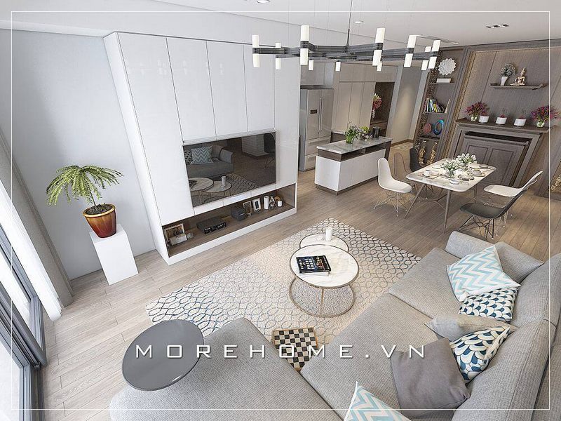 Trang trí không gian phòng khách liền bếp ăn hiện đại, sang trọng cho căn hộ chung cư.