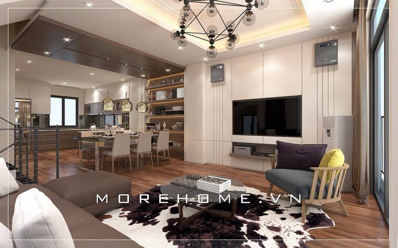 Thiết kế nội thất phòng khách liền bếp ăn hiện đại đẹp, sang trọng cho không gian nhà phố, biệt thự.