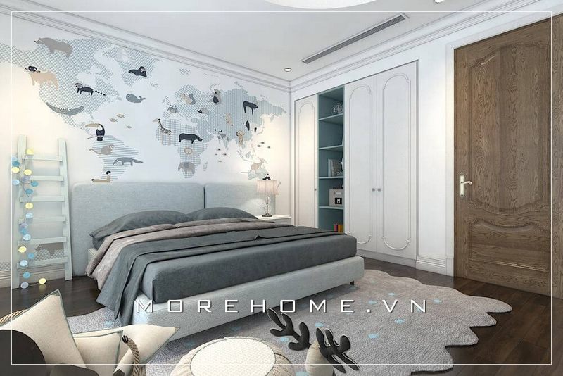 Thiết kế giường ngủ trẻ em phong cách hiện đại, với tone màu trắng chủ đạo cùng màu với nội thất khác trong căn phòng mang đến sự đồng bộ và thoáng đãng