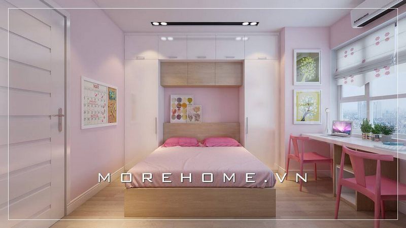 Giường ngủ bé gái hiện đại với tone màu trắng nhẹ nhàng, kết hợp tab đầu giường đa năng tiện dụng là sự lựa chọn hoàn hảo cho không gian nhỏ này