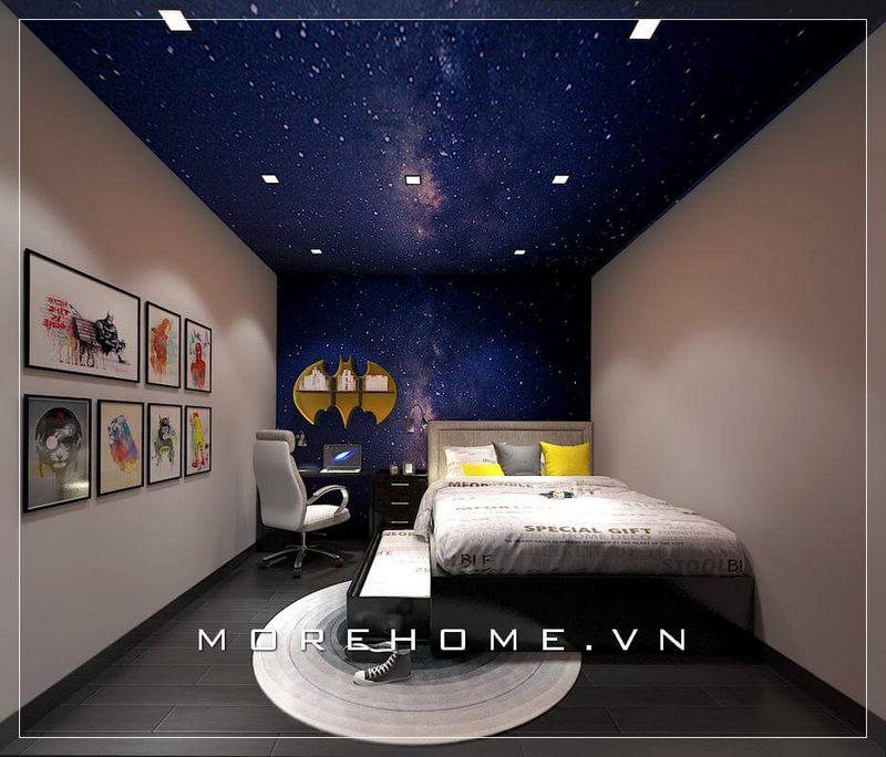 Thiết kế giường ngủ bé trai hiện đại đầy độc đáo và mới lạ, phần đầu giường cách điệu tạo điểm nhấn nổi bật cho cả căn phòng
